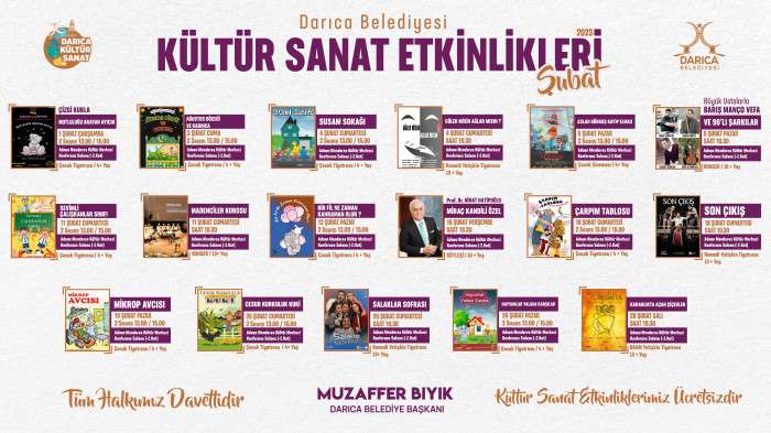 Darıca Belediyesi Adnan Menderes Kültür Merkezi Şubat ayı kültür sanat etkinlikleri yayınlandı. Söyleşiden tiyatroya, konserden seminere kadar birçok etkinlik Darıcalılara keyifli anlar yaşatacak.