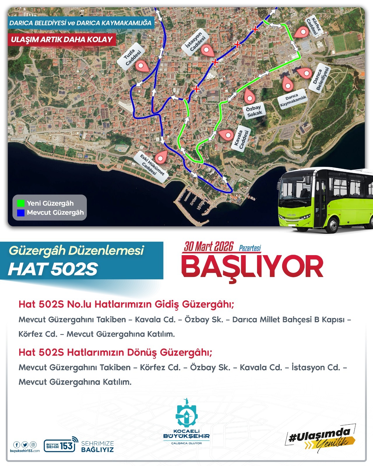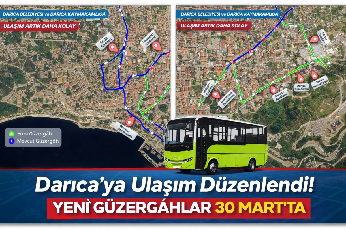 Kocaeli Büyükşehir Belediyesi, Darıca Kaymakamlığı ve Belediye hizmet binalarına erişimi kolaylaştırmak için toplu taşımada yeni güzergâhları 30 Mart itibarıyla devreye alıyor.