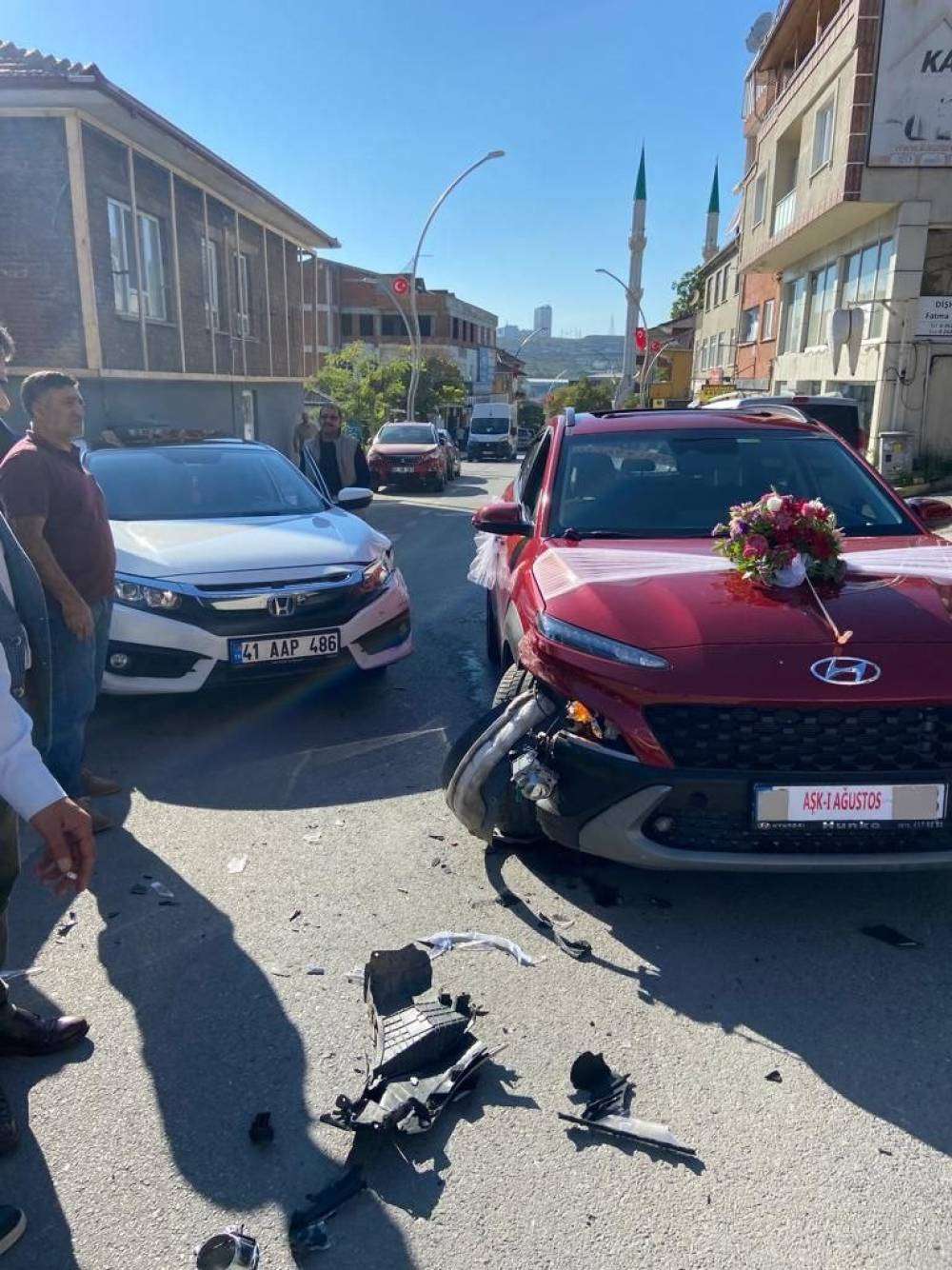 Kocaeli’de kına gecesi için fotoğraf çekimine giden çift, gelin arabasıyla kazaya karıştı. Kazada yaralanan olmadı.Kocaeli’nin Dilovası’nda ilçesinde yaşayan Yağmur Yerlikaya ve Veysel Kesik, en mutlu günlerinde kazaya karıştı. Kına gecesi için hazırlıklarını yapan ve fotoğraf çekimine süsledikleri otomobilleriyle giden çift, başka bir otomobile çarparak kaza yaptı.En mutlu günlerinde neye uğradıklarını şaşıran çift, şans eseri yaralanmadı.