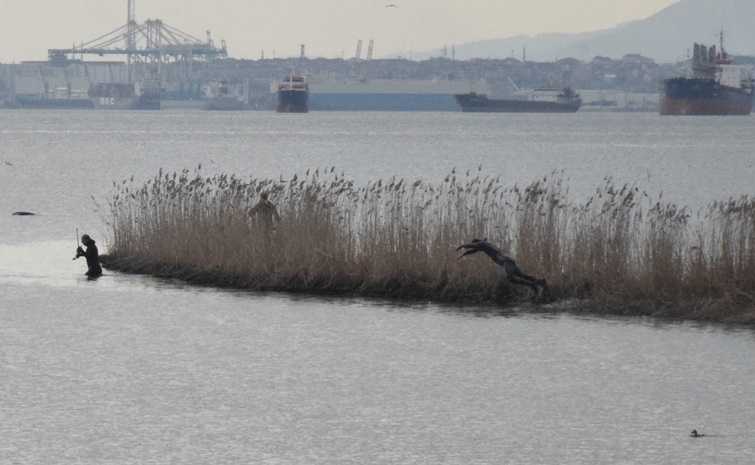 Uyarılara kulak asmayan midye avcılarından bazıları kıyıdaki sazlıkların arasına saklanırken, bazıları da suyun içinde yatarak gizlendi.