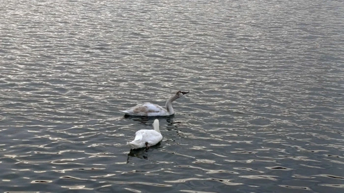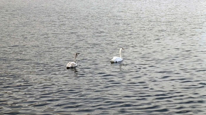 Şile Limanı’na gelen iki kuğu, sakin hava ve balıkçı teknelerinin azlığını fırsat bilerek liman içinde keyifli bir gezinti yaptı.