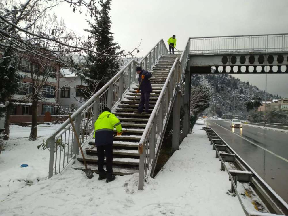 Kocaeli Büyükşehir Belediyesi Park ve Bahçeler Dairesi Başkanlığı ekipleri, bölgemizi etkisi altına alan yoğun kar yağışında özellikle yayaların olumsuz etkilenmemesi için gece gündüz çalışıyor. Yaya üst geçitleri, durak önleri ve yaya kaldırımlarında aralıksız çalışma yapan ekipler, tüm bu alanların 7/24 açık kalmasını sağlıyor.