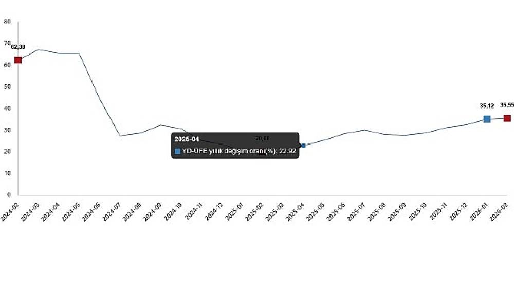 YD-ÜFE yıllık değişim oranı (%), Şubat 2026